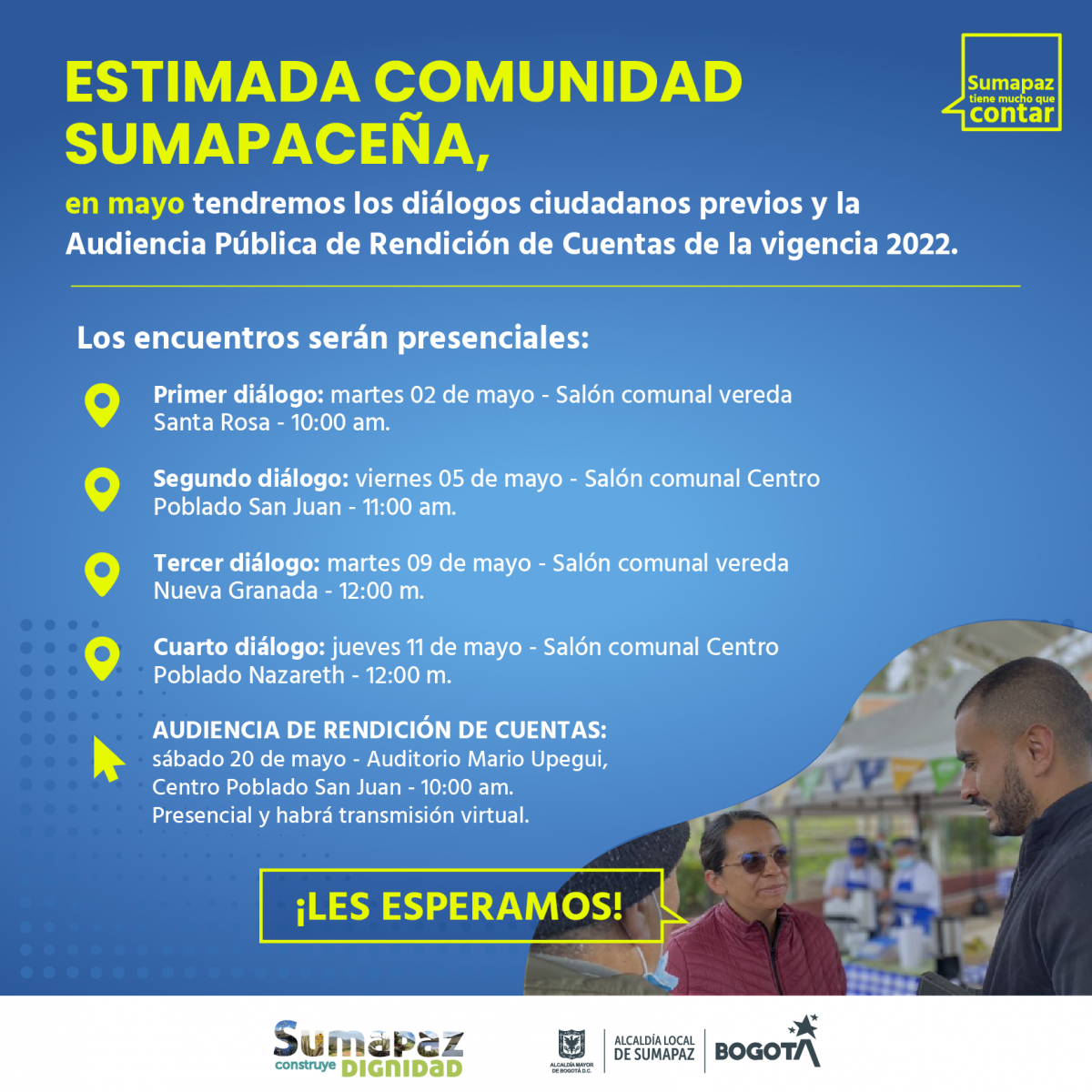 Queremos compartir con toda nuestra comunidad sumapaceña, el cronograma de las fechas que deben tener en cuenta para participar en los diálogos ciudadanos previos y en la Audiencia Pública De Rendición de cuentas de la vigencia 2022.