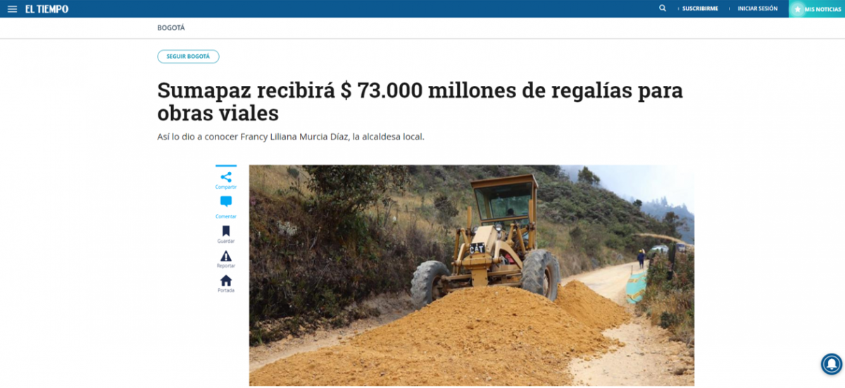 Fuente: El Tiempo / https://www.eltiempo.com/bogota/sumapaz-recibira-73-000-millones-de-regalias-para-obras-viales-449476