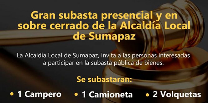 El viernes 20 de mayo se realizará una subasta pública de bienes mediante la modalidad presencial y sobre cerrado, donde se subastarán 1 campero, una camioneta y dos volquetas.