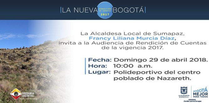 La Alcaldía de Bogotá a través de la Alcaldesa Francy Liliana Murcia Diaz, extiende una cordial invitación para que nos acompañen el día domingo 29 de abril a la audiencia de Rendición de Cuentas vigencia 2017, que se llevará a cabo en el polideportivo de Nazareth a partir de las 10:00 am. LOS ESPERAMOS.