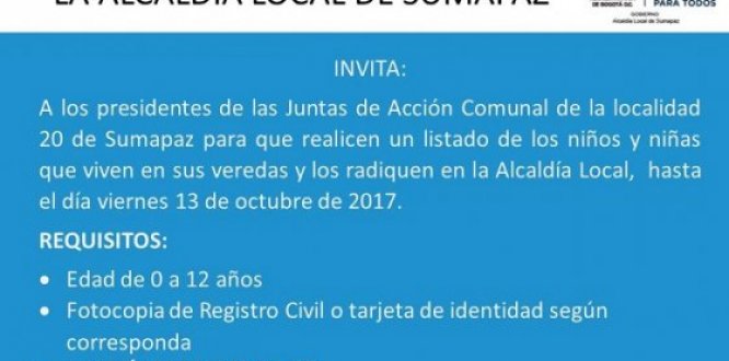 La Alcaldía Local de Sumapaz, invita a los Presidentes de las dferentes juntas de la Localidad para que realicen una lista de los niños y niñas de la Localidad.