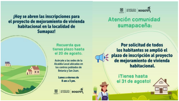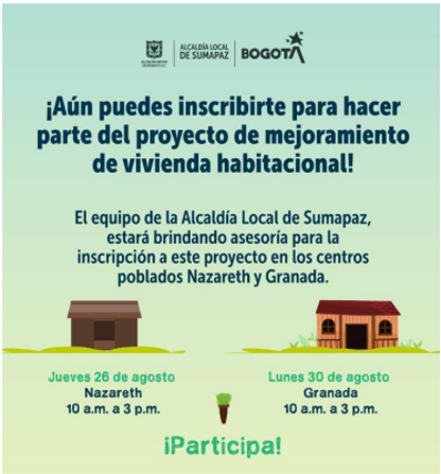 Adicional a esto, con trabajo articulado entre la Secretaría Distrital de Habitat, se estan realizando unas nuevas convocatorias para invitar a toda la comunidad Sumpaceña a participar.