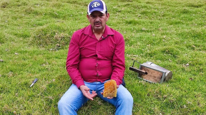 Nohely Santana es un campesino que llegó a Sumapaz hace muchos años. Él, desde muy niño, ha tenido un gran amor por las abejas y se ha dedicado a aprender cada pequeño detalle que resguardan estos seres. Y a pesar de las dificultades para el acceso a la información, Nohely se las ha ingeniado para lograr adentrarse en el ambiente de las abejas, y con ese conocimiento, explica que en el mundo pueden existir más de 20.000 especies, y que las abejas no solo son las encargadas de hacer la miel, sino que también ejercen una gran labor que nos beneficia a todos: polinizar; también, logra identificar cuáles son los procesos exactos en cada una de las colmenas y cuáles son las labores de cada una de ellas.