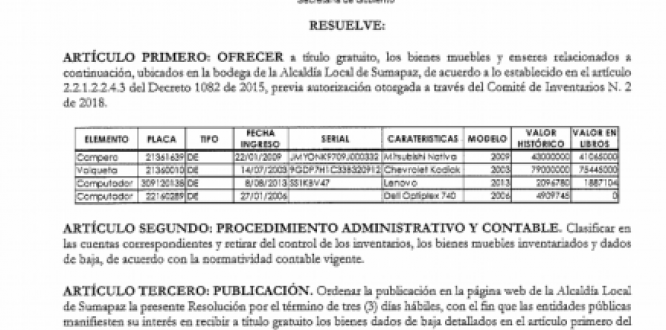 La ALCALDÍA LOCAL DE SUMAPAZ informa que a través de la RESOLUCIÓN No. 043 DEL 2018 SE OFRECEN UNOS BIENES MUEBLES DADOS DE BAJA MEDIANTE RESOLUCIÓN N. 042 DEL 25 DE JULIO DE 2018, MEDIANTE LA MODALIDAD DE ENAJENACIÓN A TÍTULO GRATUITO ENTRE ENTIDADES PÚBLICAS