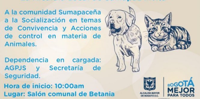 La Alcaldía Local de Sumapaz invita a la comunidad sumapaceña a la Socialización en temas de Convivencia y Acciones de control en materia de Animales.Dependencia en cargada: AGPJS y Secretaría de Seguridad.